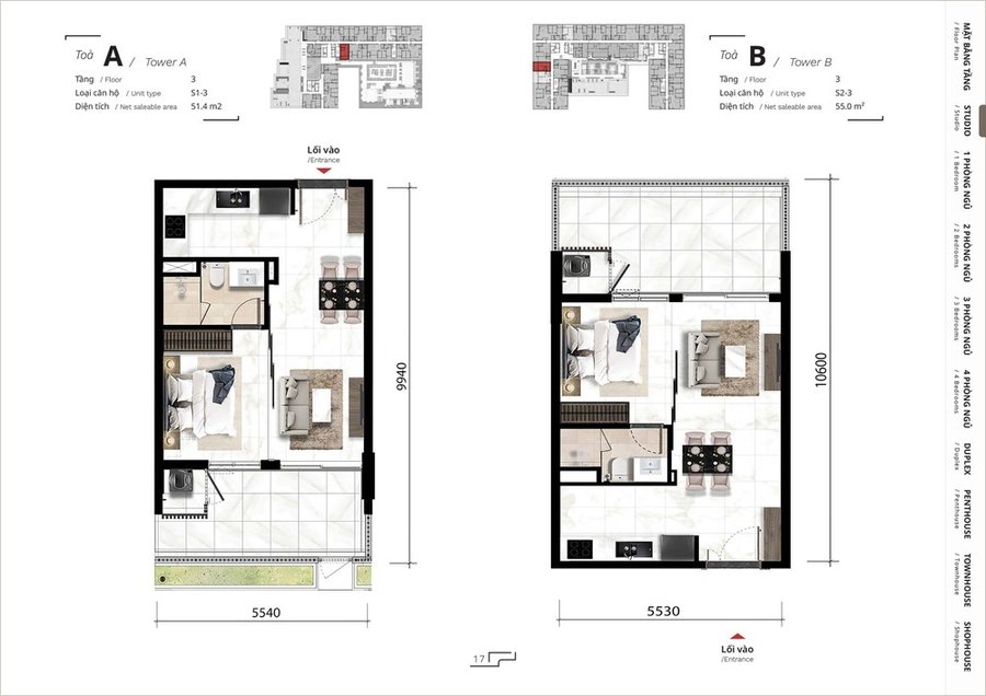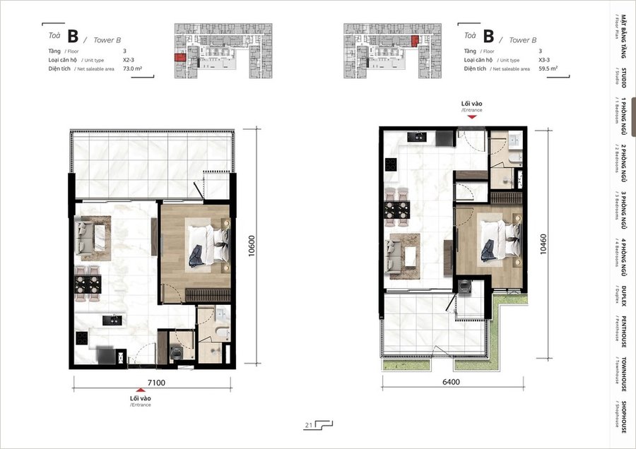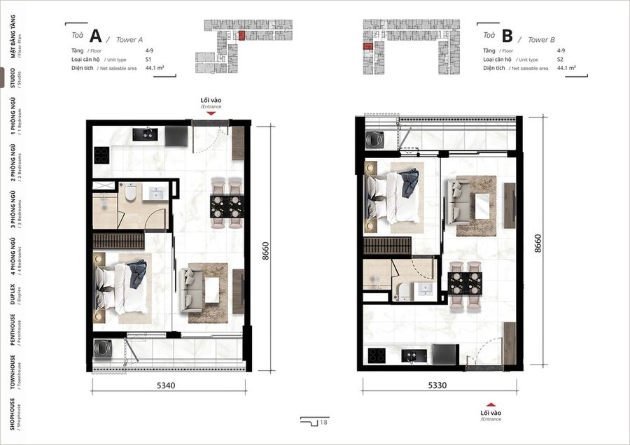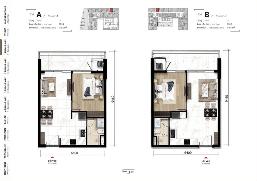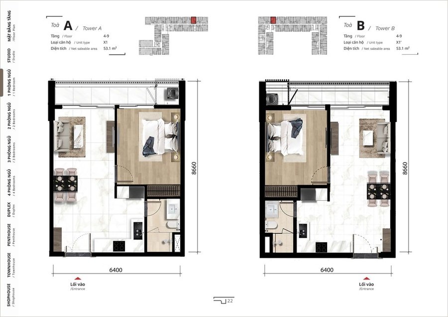 Mặt bằng căn hộ 1 phòng ngủ